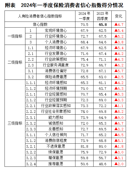 【指数成果】2024年一季度中国保险消费者信心指数70.9